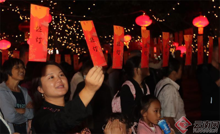 春城市民在翠湖公园赏灯观景,参加猜灯谜传统文化游园。