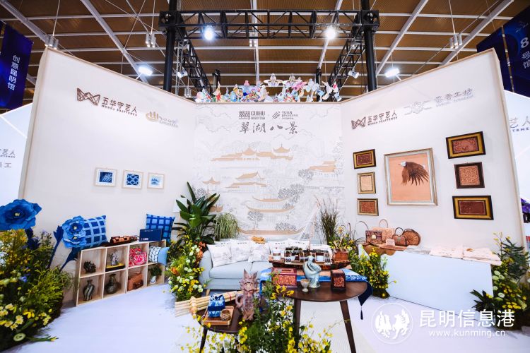 在五华展区,非遗技艺与现代生活的融合也十分巧妙。在一个生活场景中,由聿安品牌策划(云南)有限公司创作的翠湖八景作为主背景、系列文创成为了家居生活的日常;小山丽民族品牌的染色技艺挂画、装饰花也是生活的一部分,云吾工坊的皮雕挂画、皮具、皮鞋、皮包等,高氏皮雕的纸巾盒,古船模制式的茶台茶具等,非遗的技艺深入到生活的每一个角落,真正传达出非遗场景的融合创新,走进生活、融入生活,为生活“天添”新意。