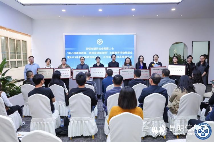 会议宣读《关于命名2023年昆明市新的社会阶层人士实践创新基地、工作站、联络点的通知》,并为17家云南省第二批新的社会阶层人士统战工作实践创新基地授牌;云南新农人总部基地、昆明市信息港两家优秀基地代表作交流发言。