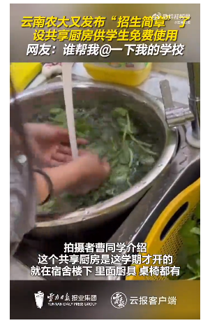 近日,云南农业大学的一名学生分享了在学校共享厨房做饭的画面。
