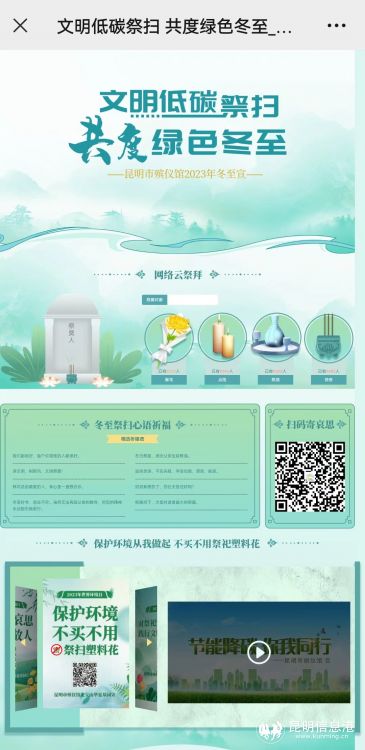 昆明信息港讯 记者尹吉 “文明低碳祭扫 共度绿色冬至”昆明市殡仪馆2023年冬至祭扫网络专题上线啦!广大市民朋友可以登录网络专题开展网上祭扫。同时,为保障广大市民身体健康和生命安全,让大家度过一个安全、文明、环保、绿色、有序的冬至,昆明市殡仪馆龙宝山华夏墓园继续推出免费“代客祭扫”服务。
