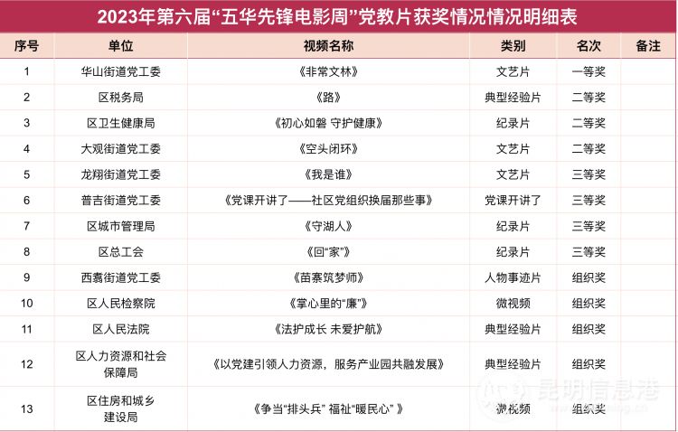 昆明信息港讯 记者李莹 12月25日,由中共昆明市五华区委组织部主办的五华区第六届“五华先锋电影周”圆满落幕。华山街道党工委选送的《非常文林》等20部党员教育视频片荣获奖项。