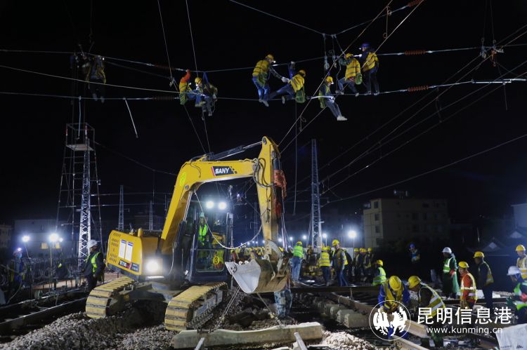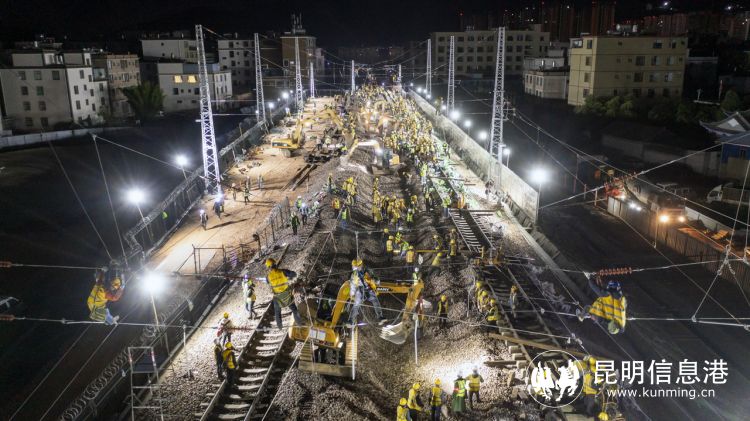 12月24日23时15分,随着最后一趟动车缓缓驶过,调度命令下达,中铁二局450名作业人员、50多台机械设备有序进场,按照既定交底的工作任务展开各项工作;回流线搭设、钢轨断开、轨排横移、人工扒砟、拨移线路、回填道砟、线路捣固、道床整理、大机捣固及安设栅栏等每一道工序有条不紊地进行。