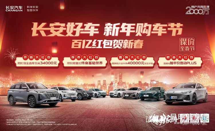 新年新诗新气象。值此辞旧迎新之际,长安汽车将于2024年1月启动全新钜惠购车礼遇,包括全系限时现金直降至高34000元,限时限量抢终身基础保养,增换购升级至高40000元现金补贴,直播间抽半价逸动PLUS等超值福利,让品质好车唾手可得,携手用户开启2024愉悦出行新体验——开长安好车,享美好生活。