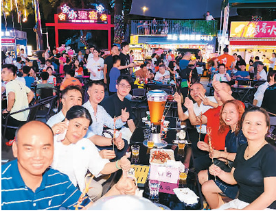 2023年7月8日,顾客在深圳盐田沙头角的“小港夜”夜市用餐、留影。