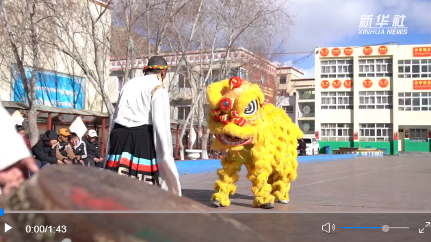 新华社拉萨1月21日电(记者孙非 丁增尼达)鼓声隆隆,回荡山谷。在西藏昌都市洛隆县硕督镇小学的操场上,威武又活泼的“狮子”正闻鼓起舞,闪跃腾挪。这是硕督镇狮子舞的寒假兴趣班课堂,今年69岁的非遗传承人邓巴阿尼正给学生们讲解动作要领。
