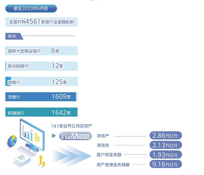 近年来,金融机构的种类更加多样,业态日趋丰富,分工更明确和细分,协作的基础不断强化。国家金融监督管理总局公布的银行业金融机构法人名单显示,截至2023年6月底,全国共有4561家银行业金融机构。机构类型包括开发性金融机构、政策性银行、国有大型商业银行、股份制商业银行、城市商业银行、民营银行、外资法人银行、村镇银行、信托公司、金融租赁公司等。其中,国有大型商业银行6家,股份制银行12家,城商行125家、农商行1609家,村镇银行1642家。此外,按照中国证券业协会数据,截至2023年6月30日,141家证券公司总资产11.65万亿元,净资产2.86万亿元,净资本2.13万亿元,客户资金余额1.93万亿元,资产管理业务规模9.16万亿元。