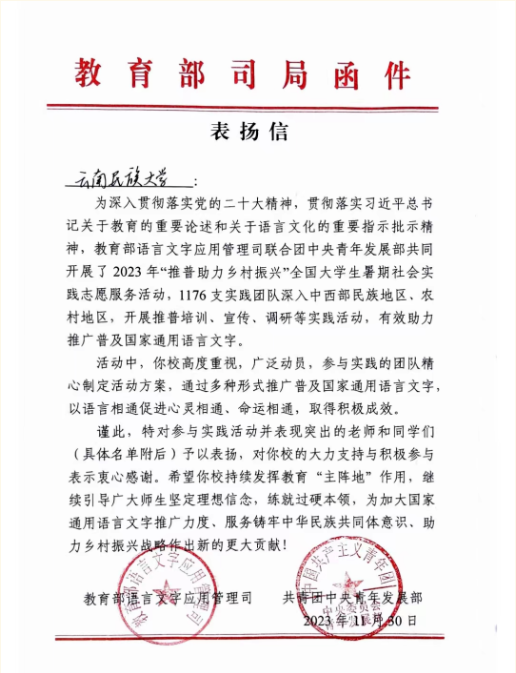 近日,云南民族大学收到教育部语言文字应用管理司和共青团中央青年发展部的表扬信,信中对云南民族大学马克思主义学院、管理学院(会计学院)组织的两支“推普助力乡村振兴”志愿服务团队表示肯定。