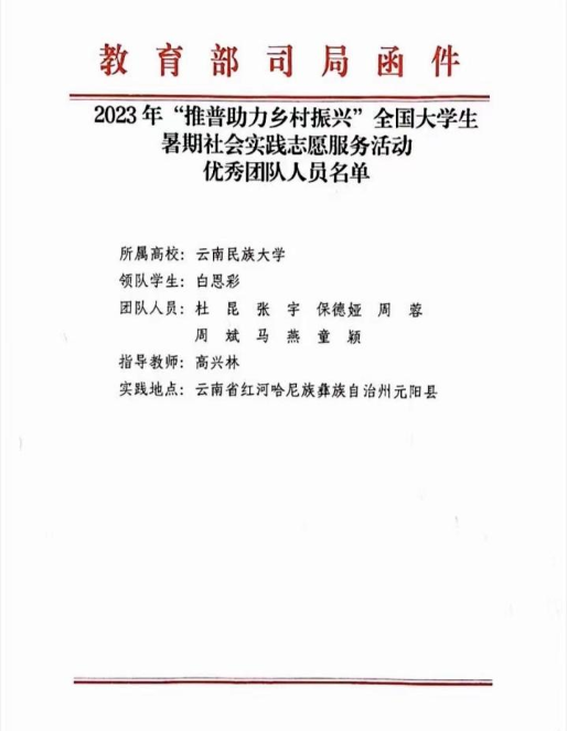 教育部语言文字应用管理司联合团中央青年发展部共同开展2023年“推普助力乡村振兴”全国大学生暑期社会实践志愿服务活动。全国1056所高校4123支团队报名,1176支团队入选,评选出240支优秀团队。其中,云南民族大学7支团队入选,两支团队获评优秀团队。