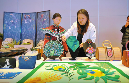 “每一件都是艺术品,让我对生活在云南的彝族和他们的文化充满好奇。”展位前,柬埔寨留学生春涵和她的朋友们对精美的彝绣产品频频点赞。
