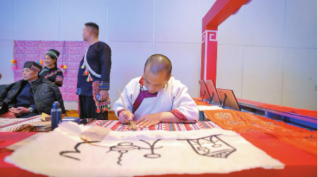 充满丽江元素的“最‘老’的春联”年俗展位上,学写东巴春联和祝福语的来宾络绎不绝。纳西东巴文化传承人和丽宝说,贴东巴春联、写东巴书画、进行东巴祈福是纳西族过年的习俗,在东巴文字中探寻中国文化的意蕴之美,勾起了大家动手做一份春节礼物的兴趣。
