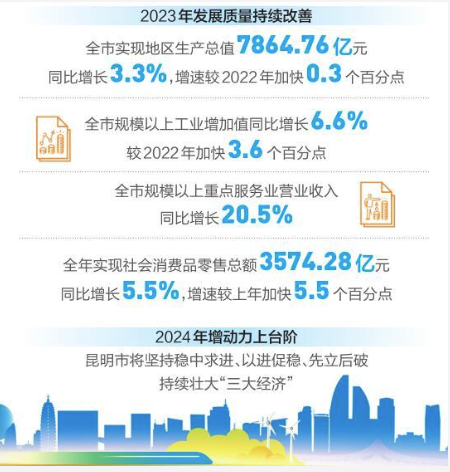 2023年,面对严峻复杂的国际环境和艰巨繁重的改革发展稳定任务,昆明市牢牢把握高质量发展首要任务,以打造“六个春城”为引领,坚持大抓产业、主攻工业,着力抓好工业强市、贸易富市、旅游兴市、金融活市,各项稳经济政策靠前发力,以超常规工作举措应对超预期的挑战,有效防范化解各种风险隐患,全年经济运行趋稳向好、生产供给持续增加,市场需求逐步恢复,发展质量持续改善。