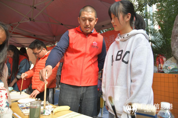 美术家们笔下春风、挥洒自如,色彩缤纷的调色盘被运用的活灵活现,片刻间,一幅幅色彩饱满、惟妙惟肖的山水画便展现在众人眼前。精湛娴熟的画功,吸引了多位中小学学生围观,他们稚嫩的脸庞上充满了好奇与敬佩。美术家邀请初中生小马亲身体验创作的乐趣,过程中,美术家耐心讲解颜色搭配、画面布局等关键环节,一同创作了一幅栩栩如生的水墨画,在场的学生们深受艺术熏陶。