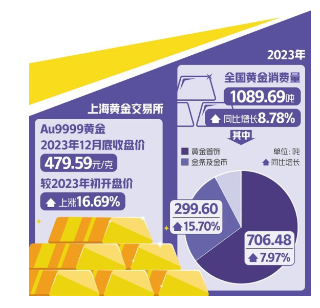 中国黄金协会日前发布的数据显示,2023年,全国黄金消费量1089.69吨,与2022年同期相比增长8.78%。其中黄金首饰706.48吨,同比增长7.97%;金条及金币299.60吨,同比增长15.70%。