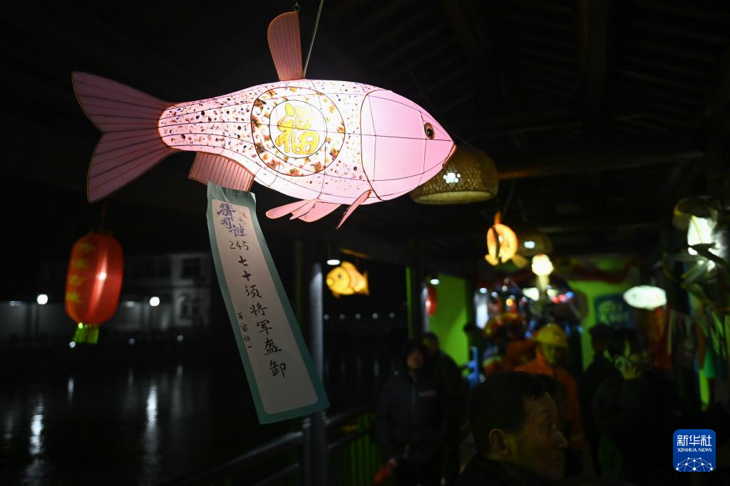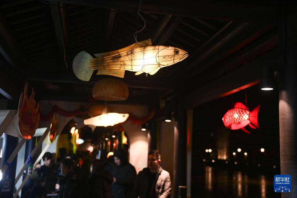 2月21日,人们在南浔区菱湖镇秀溪水街的长廊里赏鱼灯、猜灯谜。