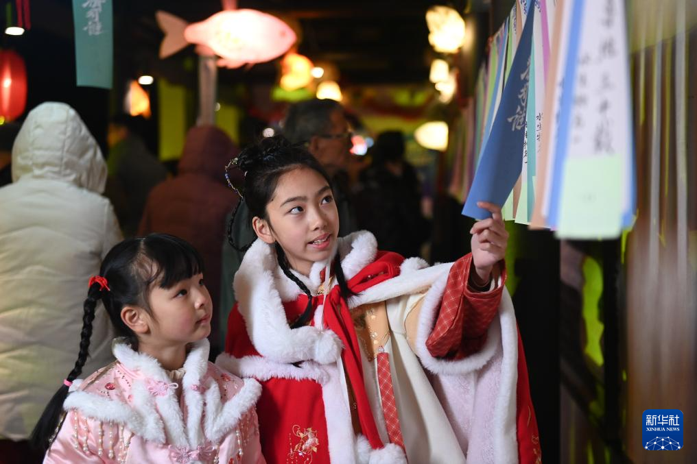 2月21日,小朋友在南浔区菱湖镇秀溪水街的长廊里猜灯谜。