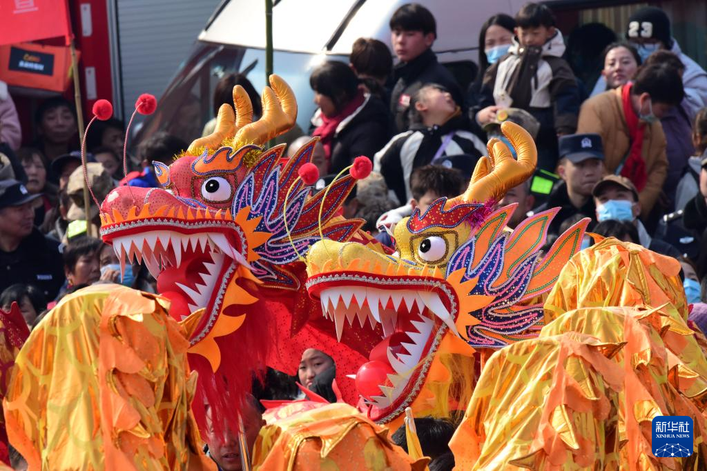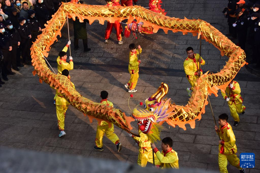 2月25日,浚县民间社火团体在古庙会上表演舞龙。新华社记者 朱祥 摄