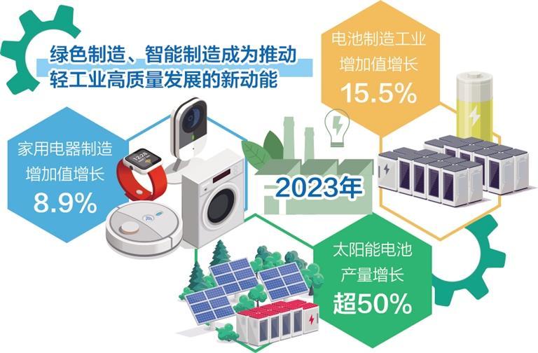 从行业来看,以太阳能电池、家用电器等为代表的轻工绿色制造、智能制造行业快速成长,成为推动轻工业高质量发展的新动能。去年,太阳能电池、家用洗衣机、家用冷柜、电冰箱、空调等产品产量保持两位数增长,其中太阳能电池产量增长超50%。电池制造工业增加值增长15.5%、家用电器制造增加值增长8.9%。