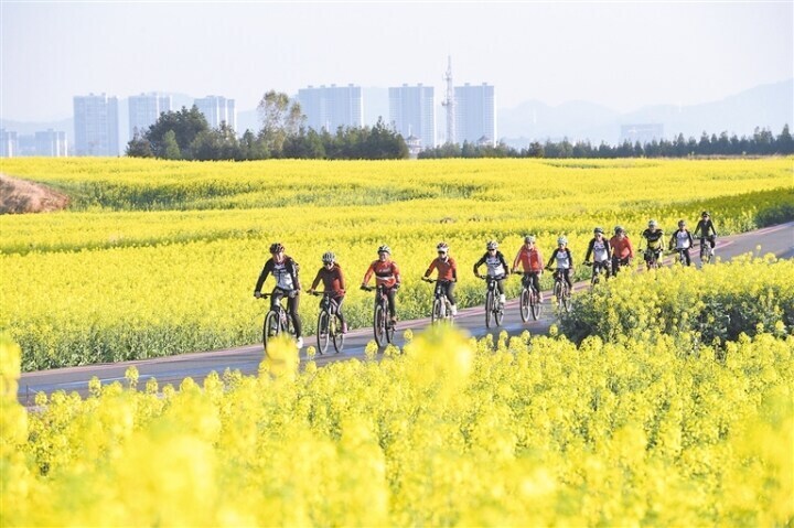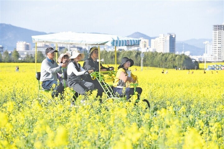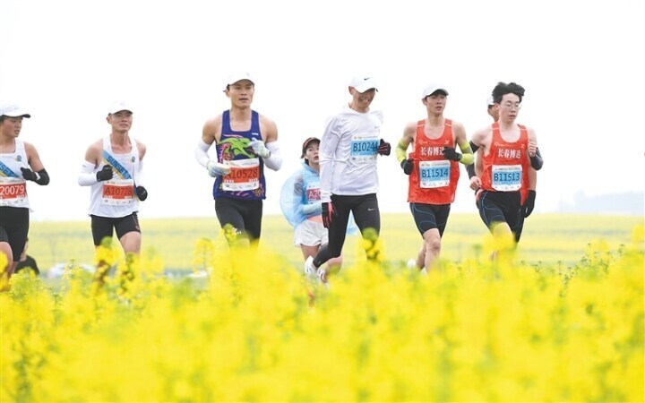 在花海赛道上,一万多名跑者奔跑在金黄色的海洋里,闻着花香,沐着春光,洒脱悠然。“这恐怕是世界上独一无二的马拉松赛道,跑着跑着会忘记比赛,放下脚步,钻进花丛,来一场浪漫的花海沐浴。”一位跑者在比赛中惬意地说。
