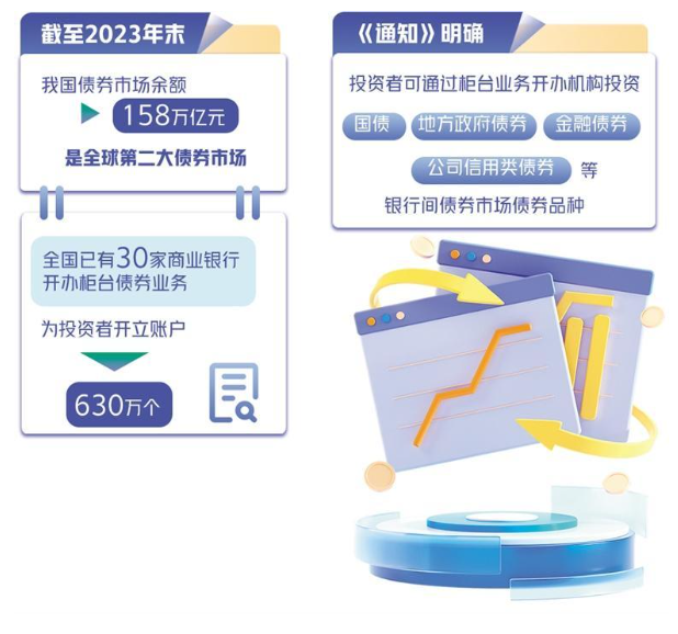 对于柜台债券业务对促进债券市场高质量发展的意义,中国人民银行有关负责人表示,一方面有利于拓宽居民投资渠道。目前,我国居民直接持有的政府债券规模较小,与成熟债券市场相比还有很大提升空间。通过柜台渠道投资债券市场,可以将储蓄高效转化为债券投资,增加居民财产性收入。另一方面有利于优化融资结构。截至2023年末,我国债券市场余额为158万亿元,是全球第二大债券市场。加快发展柜台债券业务,有利于促进直接融资发展,优化金融体系结构。此外,有利于多层次债券市场发展。柜台债券业务是银行间债券市场向零售金融和普惠金融的延伸。与集中统一的金融基础设施相比,柜台开办机构可为各类投资者提供债券托管、做市、担保品管理、清算结算一体化等各种灵活多元的综合性服务,提升市场活跃性,促进市场分层。