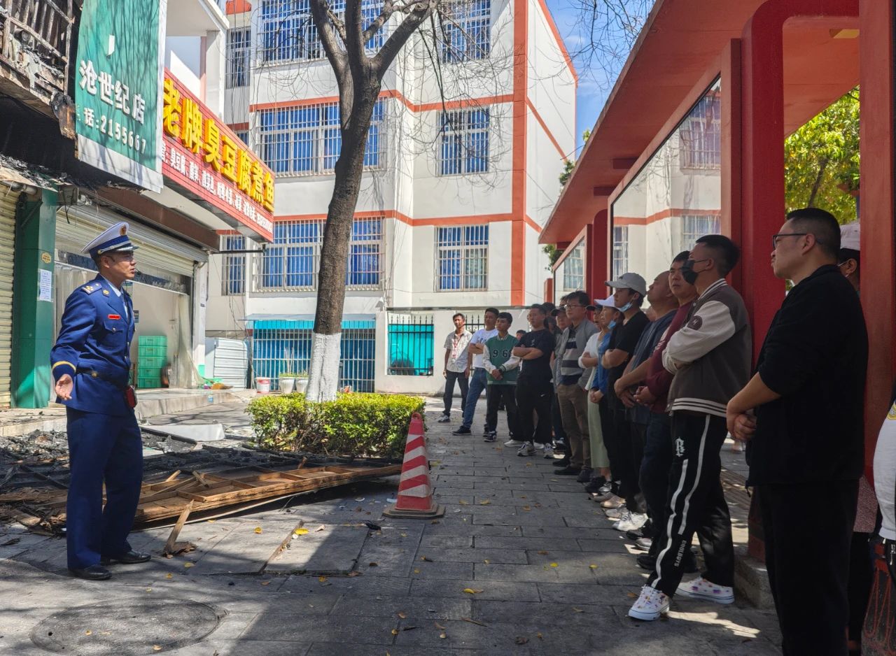 3月9日,临翔区消防救援大队联合应急管理、住建、市场监管等部门将消防安全教育课堂搬到了火灾遗迹现场,就近组织五十余户商铺业主及住户、物业管理人员听法学法防灾。