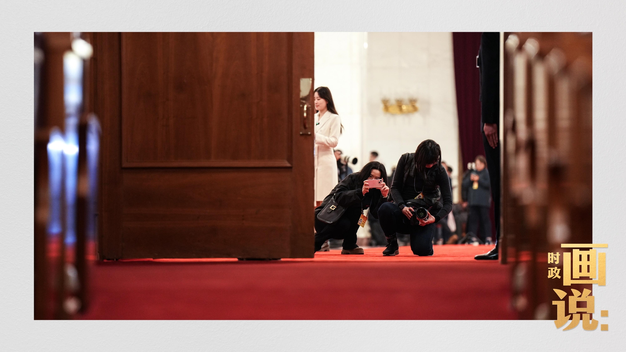 △会场外,一位摄影记者提前“踩点”,等候拍摄代表委员离场瞬间 。