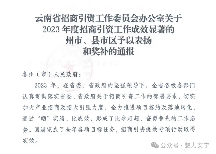 招商引资成绩突出!昆明市、官渡区、安宁市被通报表扬