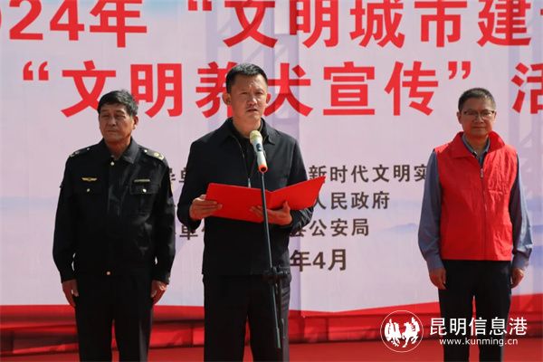 昆明信息港讯 记者合宇聪 4月9日上午,嵩明县公安局联合各镇(街道)、园区,县农业农村局、县市场监管局等单位开展“文明养犬 ”主题宣传活动。副县长、县公安局党委书记、局长杨绍聪,各镇(街道)、园区,县农业农村局、县市场监管局、县公安局相关分管领导及工作人员90余人参加此次活动。