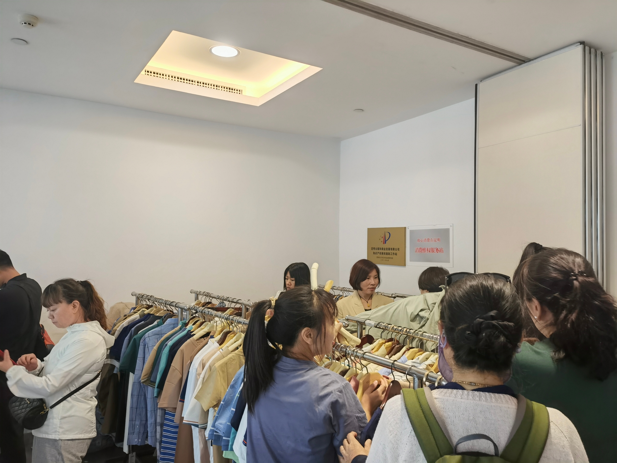 随后,记者来到该购物中心7楼,在一个房间内,挂满了暇步士的服装,男装女装都有,以春秋装和夏装为主,房间内挤满了前来抢购的消费者。