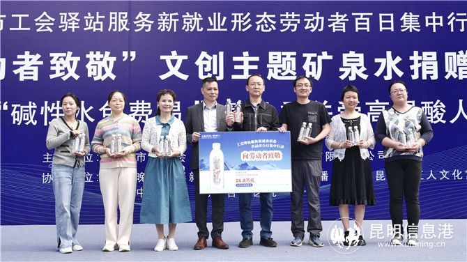 昆明信息港讯 记者江枫 4月20日,昆明市工会驿站服务新就业形态劳动者百日集中行动——“向劳动者致敬”文创主题矿泉水捐赠仪式暨石林天外天“碱性水 免费喝”第八季关爱高尿酸人群公益活动,在昆明市工人文化宫广场举行。