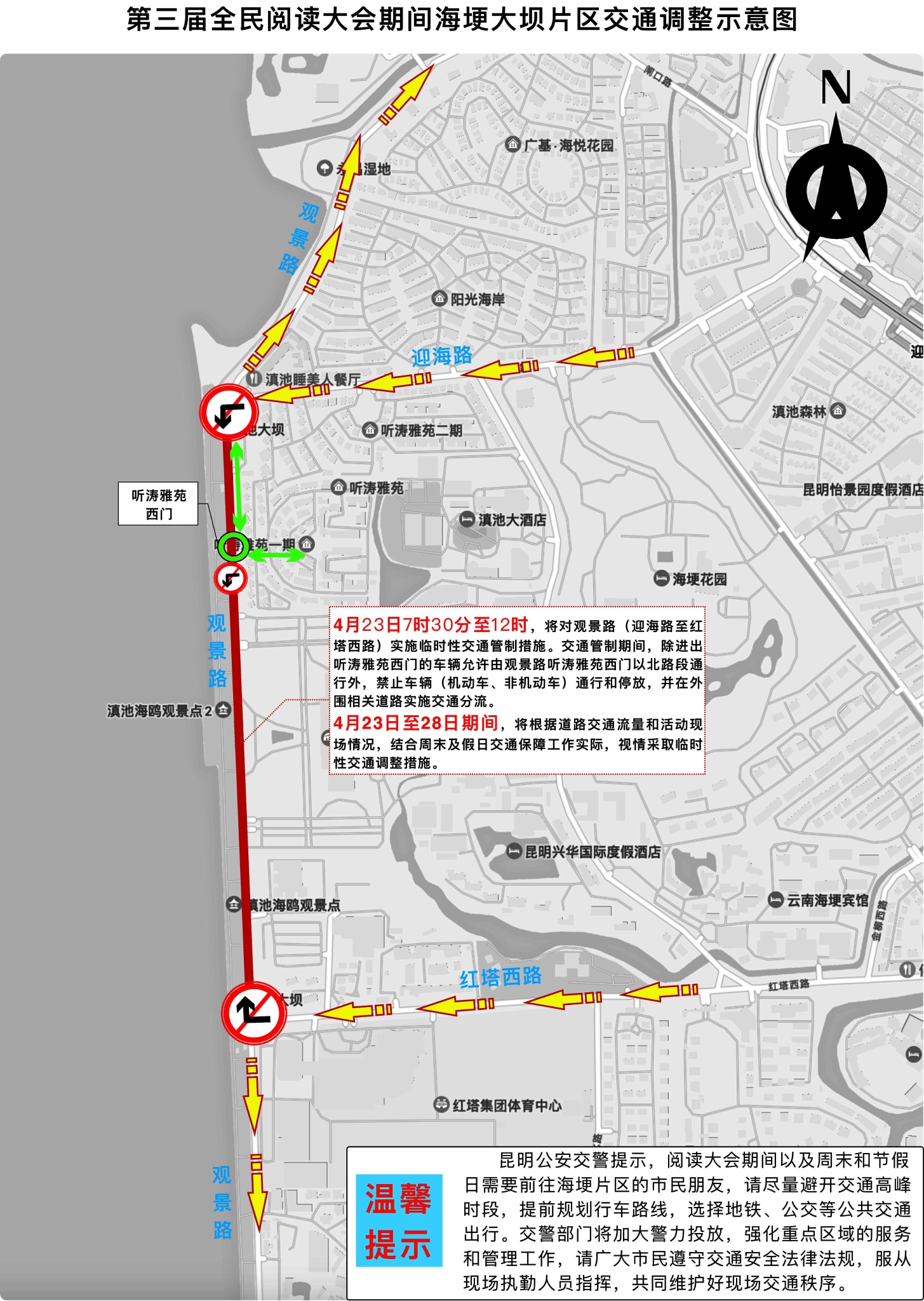 由中宣部、云南省委、省政府主办的第三届全民阅读大会(以下简称“阅读大会”)将于2024年4月23日至25日在昆明市举办。为确保阅读大会期间的交通安全、有序、畅通,根据《中华人民共和国道路交通安全法》有关规定,将对海埂大坝片区实施临时性交通管制(调整)措施,特做以下交通出行提示: