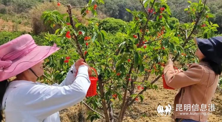 昆明信息港讯 记者杨雁 4月迎来樱桃成熟季,位于安宁市县街街道小红祥村127户农户房前屋后的600余亩樱桃陆续进入成熟期,鲜红的果实挂满枝头。该村近几年改良后种植的新品种红妃、红宝石等樱桃口味颇受群众喜欢,四面八方的游客纷纷前来入园采摘新鲜果实。