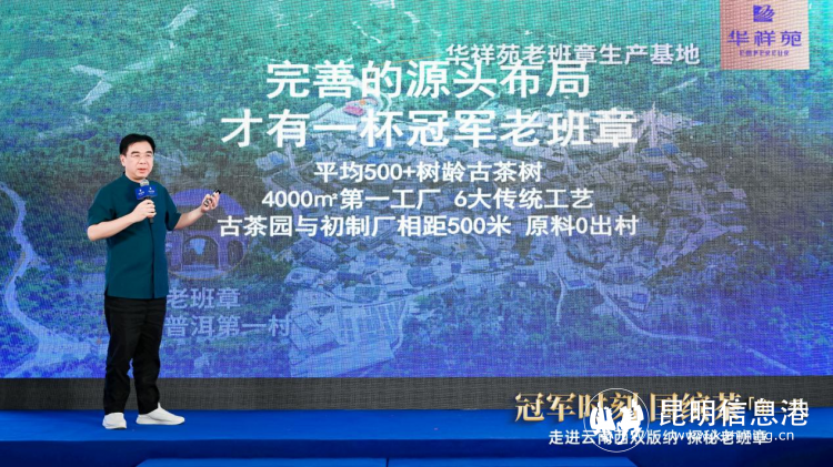 “做好老班章品牌是我一生的事业,打造茶中茅台,做‘老班章第一品牌’,助力老班章走向世界是华祥苑始终坚守的初心。”华祥苑茶业股份有限公司董事长肖文华表示,完善的源头布局,才有一杯冠军老班章。早在2003年华祥苑便已开始涉足云南普洱茶,为了确保华祥苑老班章“每一片茶叶都来自老班章村”,华祥苑坚持从源头制一杯好茶,在老班章村建立四千平米并具有SC认证的工厂,打造老班章原料“保真”供应链。
