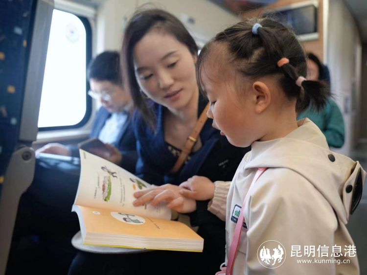 在书香列车上,每节车厢两侧的车窗内张贴着第三届全民阅读大会标识和书香铁路标识,车厢入口处、两端镜框展牌均张贴全民阅读主题海报和从昆明市部分中小学、幼儿园征集评选出的“我眼中的中国铁路”优秀绘画作品。车厢里,每个座位的头枕片上都印刷着第三届全民阅读大会标识,列车视频播放全民阅读公益广告。为了给旅客提供良好的阅读条件,每节车厢一端都设置了书兜,餐车还设置读书角摆放优秀图书。列车上弥漫着浓浓的读书氛围。许多旅客手捧图书,不少家长还为随行的儿童借来童书,让孩子们徜徉在阅读的快乐中。