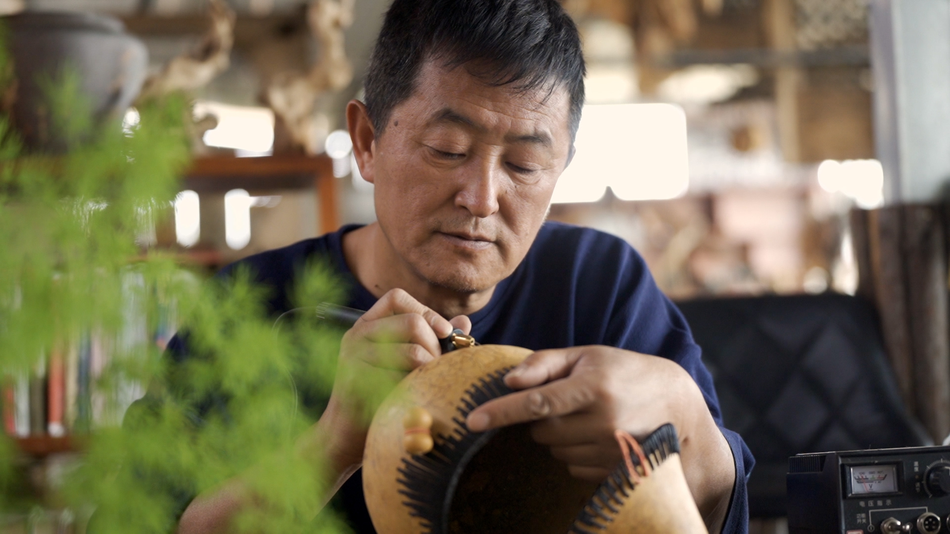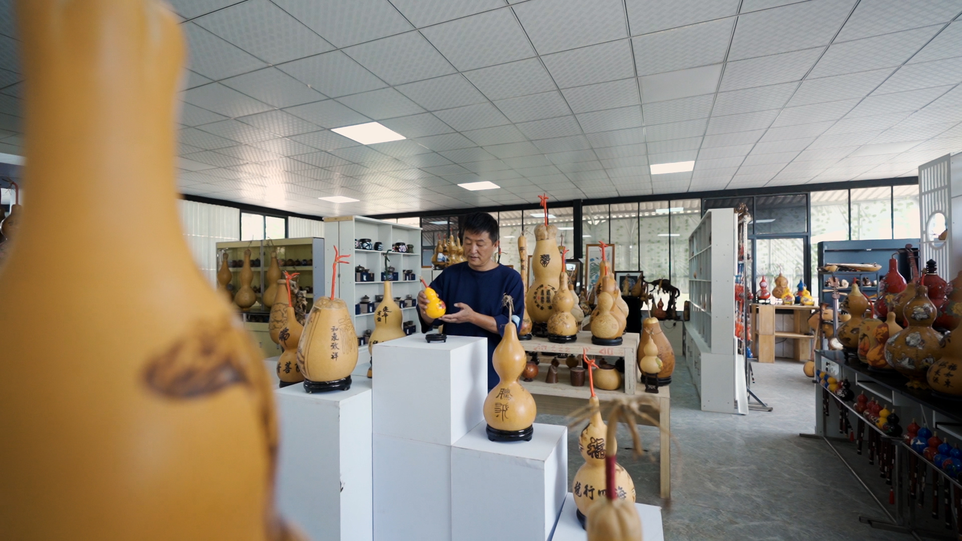 葫芦雕绘是一种以葫芦为载体,用雕刻、火绘等手法制作手工艺品的技术,它赋予了葫芦新的生命与文化内涵,葫芦的雕绘图案有山水、鸟兽、人物、字体等,山水烟雾缭绕,鸟兽栩栩如生,人物形态各异,富有美好的寓意。到今年,徐孝国已经在葫芦雕刻非遗传承“深耕”22年了,除了给葫芦雕刻、绘画上精美图案,他还不断创新开发出富有自己特色的葫芦吉他、葫芦马头琴、葫芦酒瓶等,作品极具特色深受国内外消费者的喜爱。