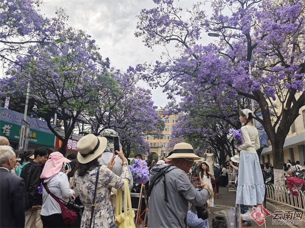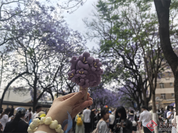 “五一”假期,蓝花楹是昆明当之无愧的“顶流”之一,在教场中路的一棵蓝花楹树下,来自湖南的武先生正在给手拿蓝花楹文创雪糕的女友拍照,武先生告诉记者:“这里太热闹了,盛开的蓝花楹真的很美,能拍到好看的照片,还是挺开心的。”随着蓝花楹的走红,其文创产品、文创雪糕也跟着火了一把,在道路两边有很多文创雪糕和文创产品的摊位,供游客挑选购买。