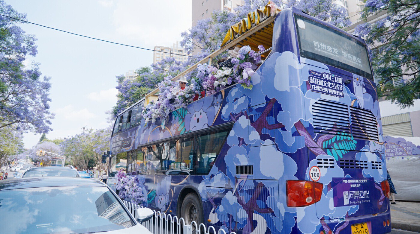 在生活美学市集上,蓝花楹元素隐藏在各个角落。除了穿上梦幻“外衣”的双层赏花巴士,还有更像蓝花楹的文创雪糕,蓝花楹冰箱贴和胸针等文创产品。号称“新中式出片神器”的非遗漆扇也配合着出了蓝花楹主题DIY体验。找到独属于自己的一份“蓝花楹+”创意,是赏花之外的惊喜。