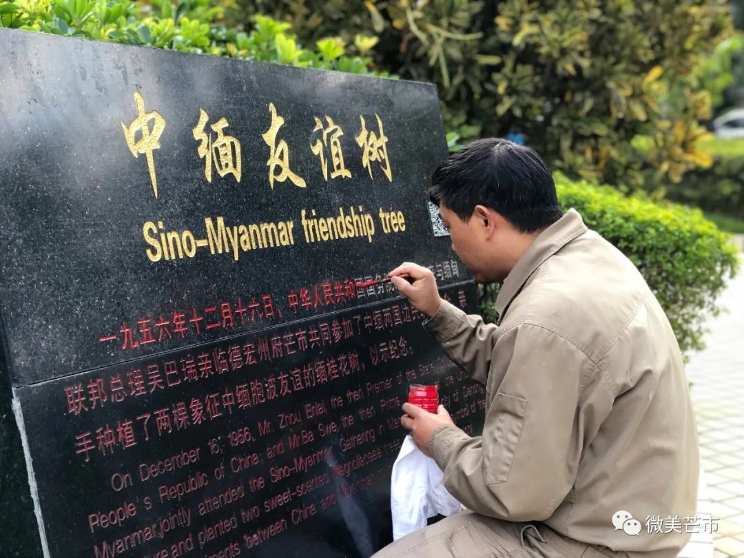 工作人员为中缅友谊树纪念碑上的文字添色 王悦 摄