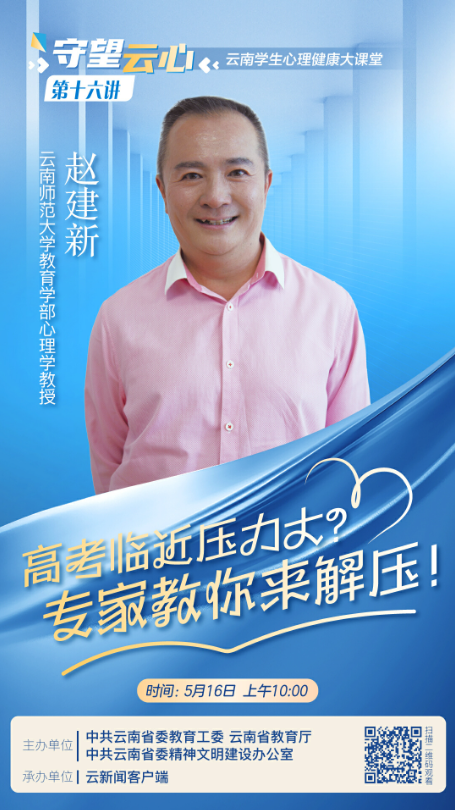 “守望云心”云南学生心理健康大课堂第十六讲,特邀云南师范大学的心理学教授赵建新,将于5月16日上午10:00在云新闻客户端上线,谈谈高考前如何正确地调整心理。