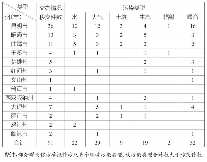 云南省中央生态环境保护督察群众来信来电举报污染类型统计表 (第十九批)
