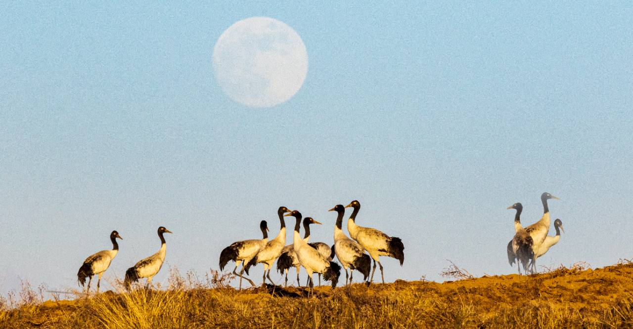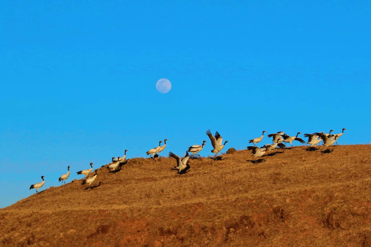 秋天里的大山包,是一个“暖意融融”的美拉德世界。从清晨到傍晚,从日出到日落,大自然赠予的色彩疗愈留下美轮美奂的剪影,日月同辉,鹤月同框的浪漫,更是美出了天际!