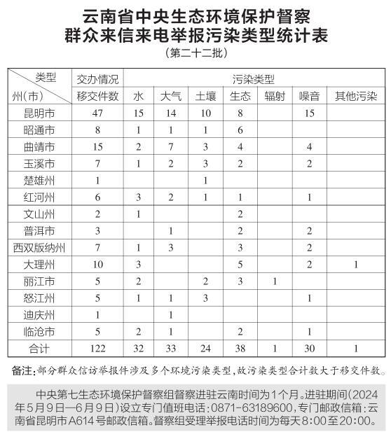 5月31日,中央第七生态环境保护督察组向云南移交第二十二批群众信访举报件122件,其中来电举报50件,来信举报72件。从信访举报件生态环境问题污染类型来看,涉及水32件、大气33件、土壤24件、生态38件、辐射1件、噪音30件、其他污染1件。从区域分布上看,昆明市47件、昭通市8件、曲靖市15件、玉溪市7件、楚雄州1件、红河州6件、文山州2件、普洱市3件、西双版纳州7件、大理州10件、丽江市5件、怒江州5件、迪庆州1件、临沧市5件。截至当日,云南省已累计收到中央第七生态环境保护督察组交办的信访举报件2082件,所有举报件均已及时转交相关州(市)处理。