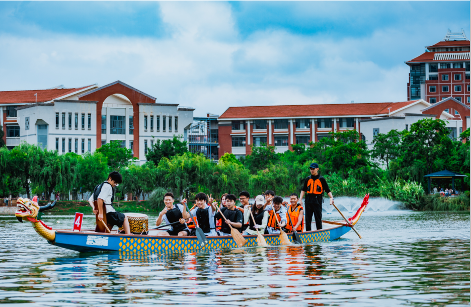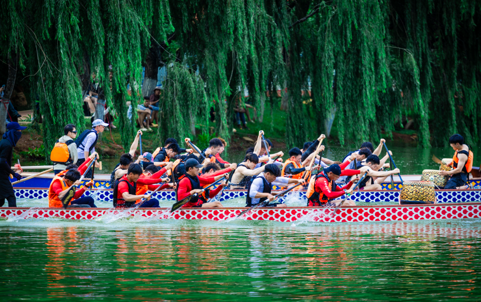 在由舞龙、舞狮、彩带龙组成的开场表演后,云南民族大学党委副书记赫诗锦宣布活动开幕,跟随嘉宾一起为龙舟“点睛”。据悉,此次比赛分为专业组和非专业组以计时淘汰方式进行,由师生组成的38支参赛队伍按小组依次上船比赛。随着发令枪响起,选手们随鼓点奋力划桨,龙舟在雨花湖上踏浪前行,场面热烈,吸引了大批师生现场观看、呐喊助威、留影拍照。