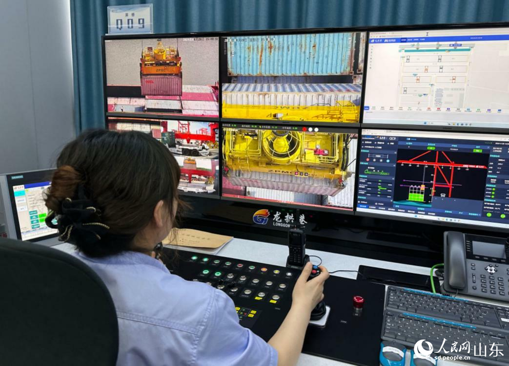 龙拱港自动吊装设备“驾驶员”在控制中心屏幕前远程操控。人民网 乔姝摄