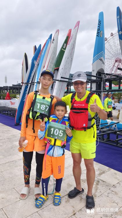 昆明的一家四口桨板爱好者也来到了赛场上,父亲时扬和两个儿子参加了不同组别的比赛。父亲是桨板持证2年的教练,他指导14岁和8岁的两个儿子进行桨板训练有半年时间,如今两个孩子对桨板运动都抱有很大兴趣。在今天的比赛中,弟弟参加U9组长距离赛获得了第二名的好成绩;哥哥参加U15组长距离赛获得第六名,同时哥哥参加200米竞速赛获预选赛小组第二名出线,明天将进逐决赛;爸爸夺得大师组长距离赛第12名,在200米竞速赛预选赛中夺得小组第四名出线,明天也将参加决赛。父子三人认为,桨板运动是一项在开放水域接触自然的运动,在娱乐和锻炼的同时,可以通过比赛历练自己,获得更好的成长。