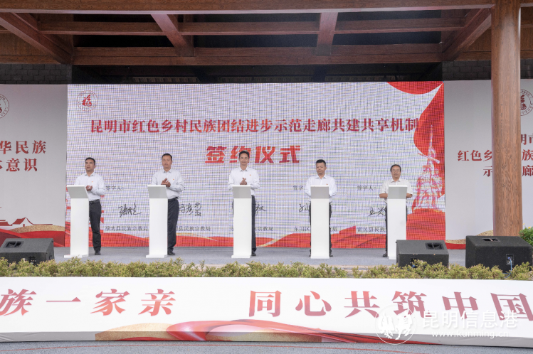 活动现场,红色乡村民族团结示范走廊沿线5个县(区)代表共同签署了《昆明市红色乡村民族团结示范走廊共建共享机制框架协议》。根据协议内容,通过建立基层组织联建、区域发展共促、民族团结共创、精神家园共筑、交流活动共办、社会管理共治、先进经验共学等机制,推进“一圈三走廊”建设,促进各族群众铸牢中华民族共同体意识,着力推动各民族政治上团结统一、经济上共同富裕、文化上美美与共、社会上互嵌互融、生态上和谐共生,实现更大范围、更高水平、更高层次的共建共享,把红军长征过昆明的“红色乡村”打造成民族团结进步教育的大课堂,民族团结进步示范的绿美乡村,让铸牢中华民族共同体意识在乡村振兴中有形有感有效推进。