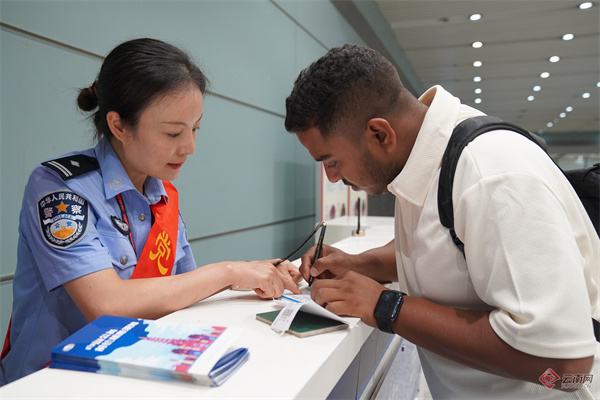 昆明边检站的民警为享受免签政策的旅客办理了免签入境