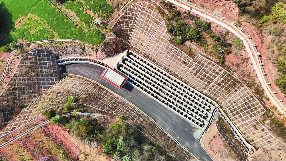 在设置鱼道恢复马龙河连通性示意图上能够清晰地看到,鱼群进入鱼道进鱼口后需要通过三个回转爬升段。回转爬升段就像一把折叠尺,每段距离、坡度都经过严格测算,与鱼群的“爬坡能力”相匹配。在车马碧水库鱼道试运行中,鱼群通过这条2.64公里长的鱼道,可以轻松游过大坝。