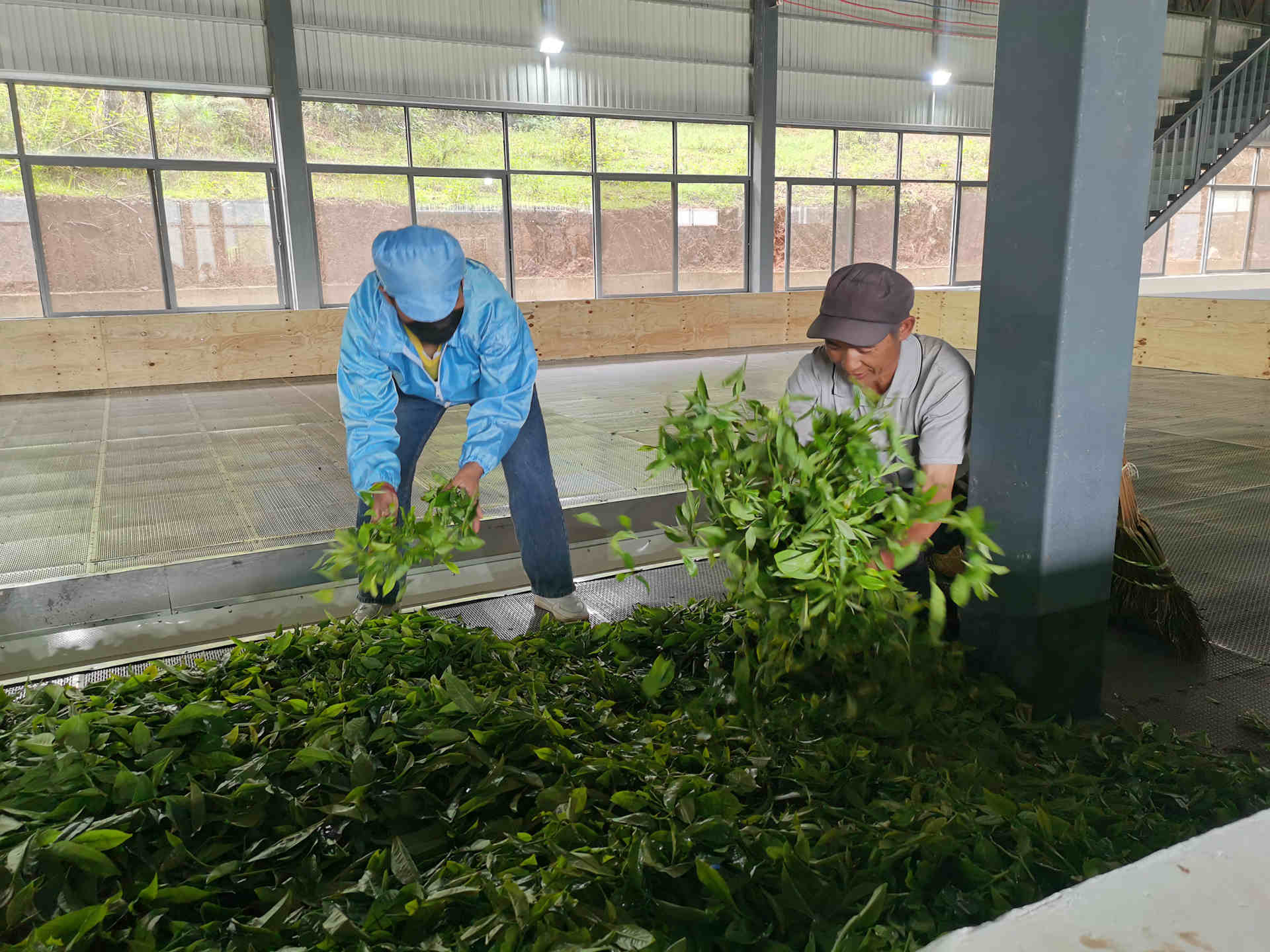 在附近的茶叶加工厂里,茶农们正在依次排队、称重,过秤后的茶叶被均匀地铺晾在工作台上。一旁的传送带、杀青机、捻揉机、烘干机都静静地休息着——它们的高光时刻将在晚上八九点钟来临。