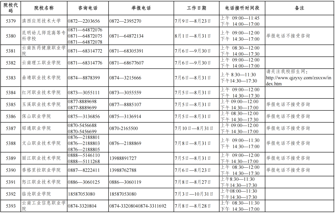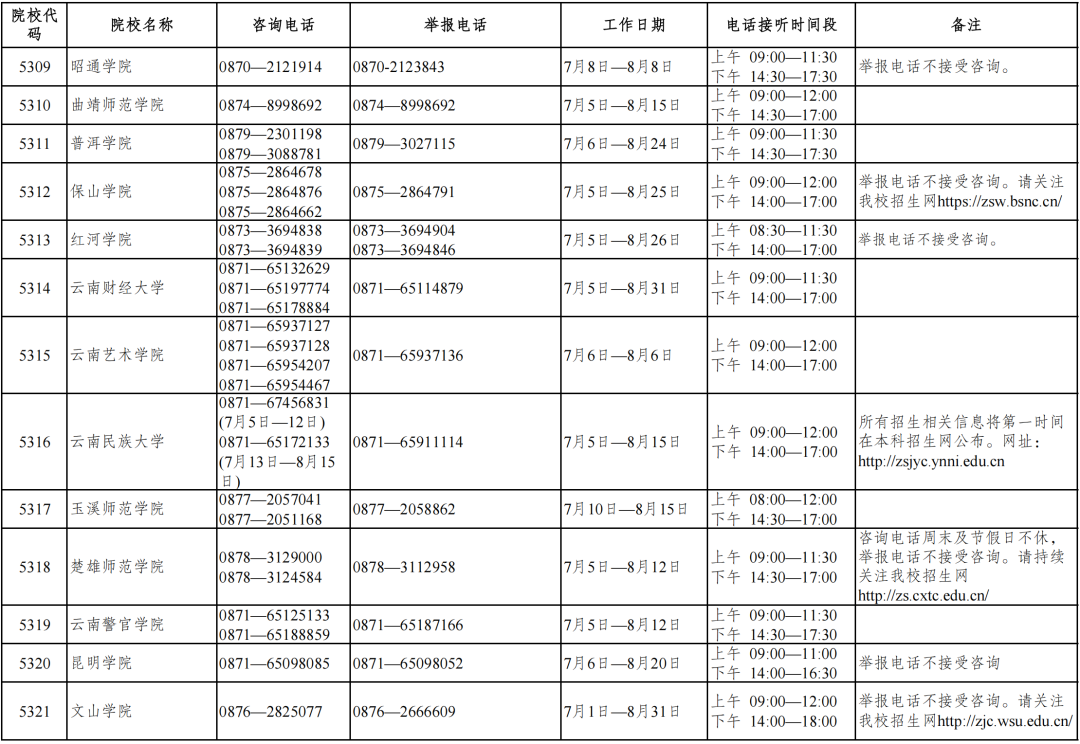 昆明信息港讯 日前,云南省招生考试院公布2024年普通高校招生录取期间、咨询及违规举报联系方式,详情如下: